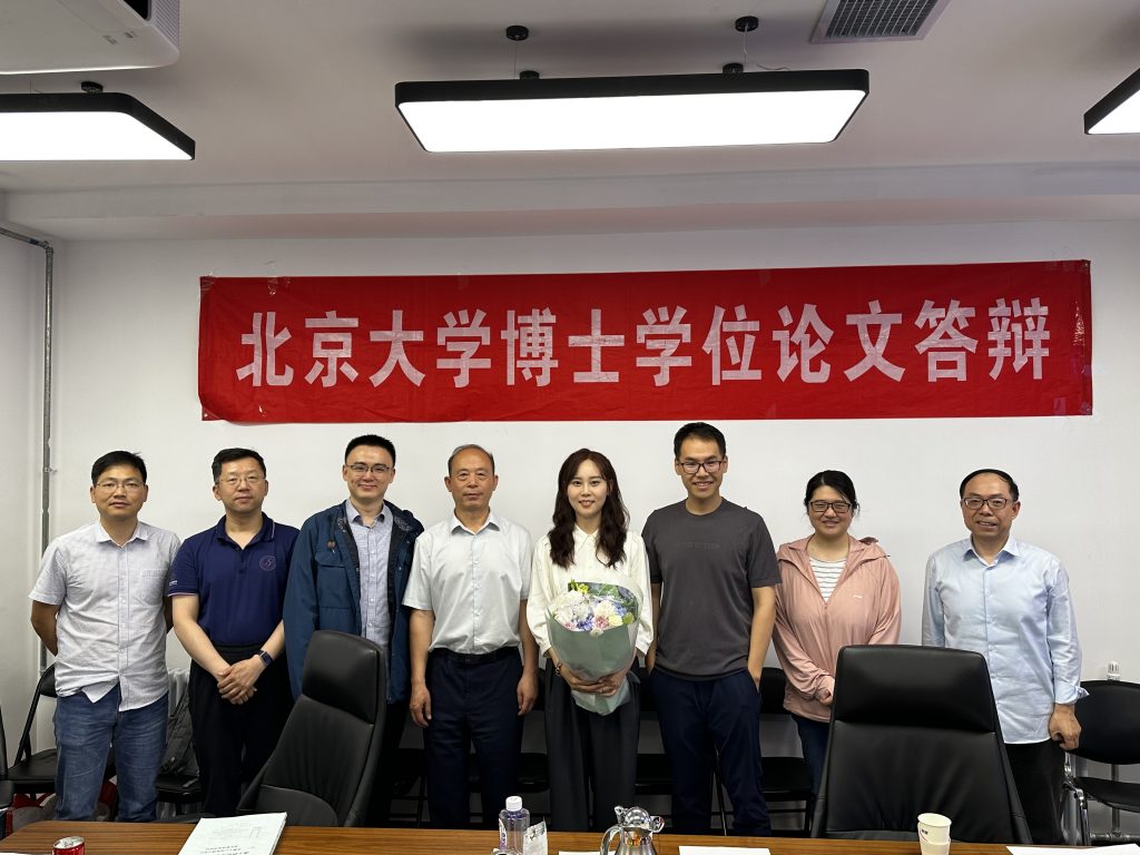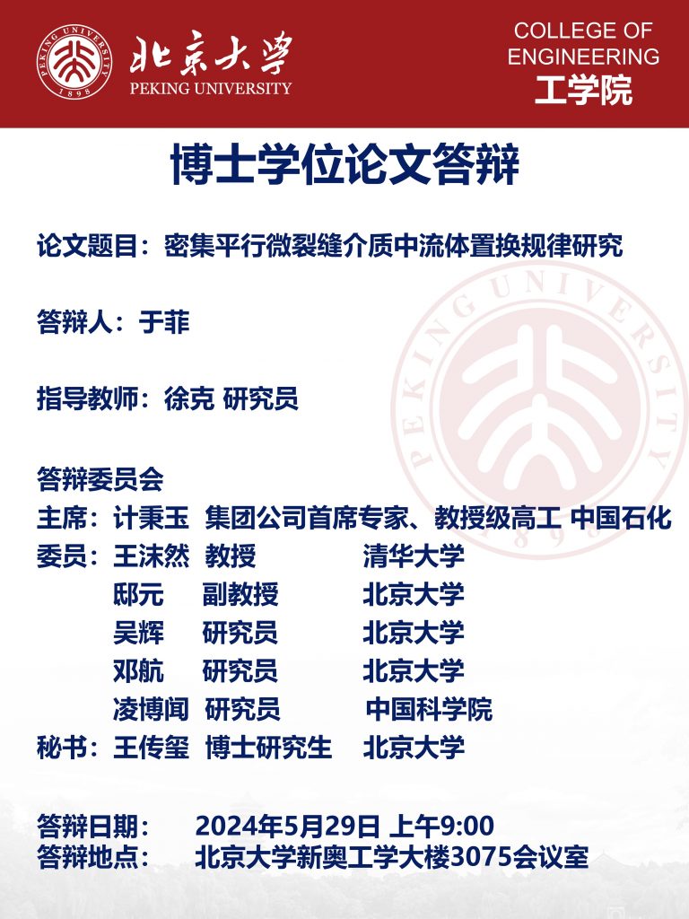 2024年5月29日 恭喜于菲通过博士学位论文答辩! 2024年5月29日上午,于菲同学在新奥工学大楼3075会议室开展了题为《密集平行微裂缝介质中流体置换规律研究》的博士学位论文答辩,答辩委员会老师们一致认为论文已达到博士论文水平,同意通过于菲同学的博士论文答辩,并建议授予工学博士学位。 由左至右依次为:北京大学吴辉老师、清华大学王沫然老师、中科院力学所凌博闻老师、中石化集团公司首席专家计秉玉、北京大学于菲博士、北京大学徐克老师、北京大学邓航老师、北京大学邸元老师。